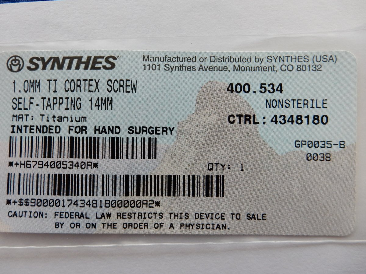Synthes 400.534 1.0mm TI Cortex Screw Self-Tapping 14mm
