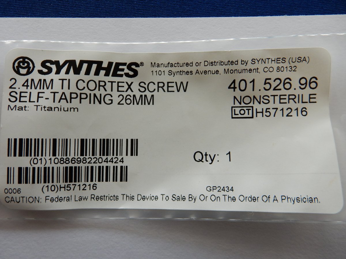 Synthes 401.526.96 2.4mm TI Cortex Screw Self-Tapping 26mm
