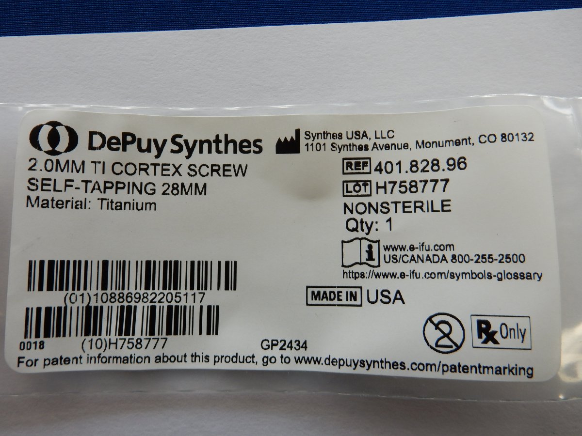 Synthes 401.828.96 2.0mm TI Cortex Screw Self-Tapping 28mm