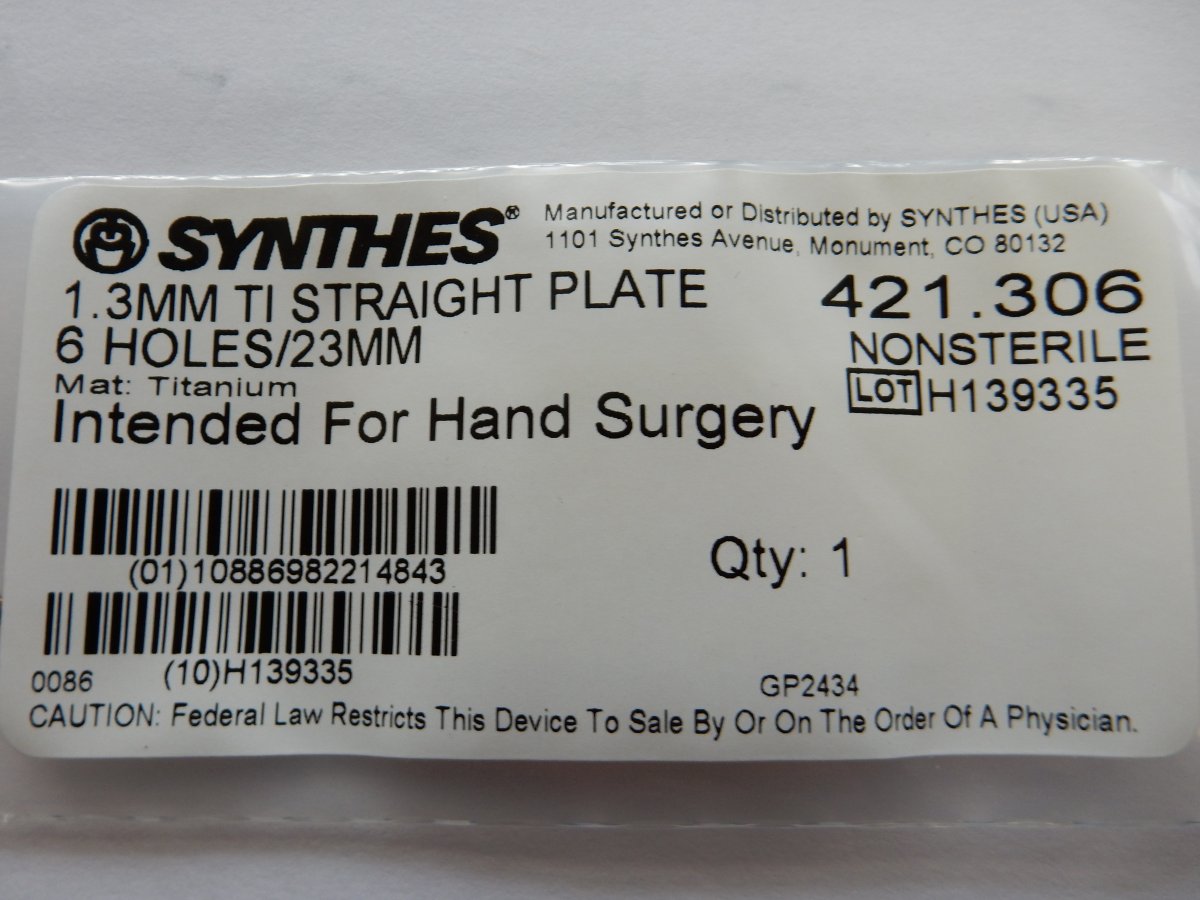 Synthes 421.306 1.3mm TI Straight Plate 6 Holes/23mm